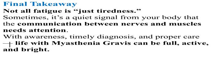As a result, muscles tire quickly and recover after rest — creating the pattern of “weakness that comes and goes.”